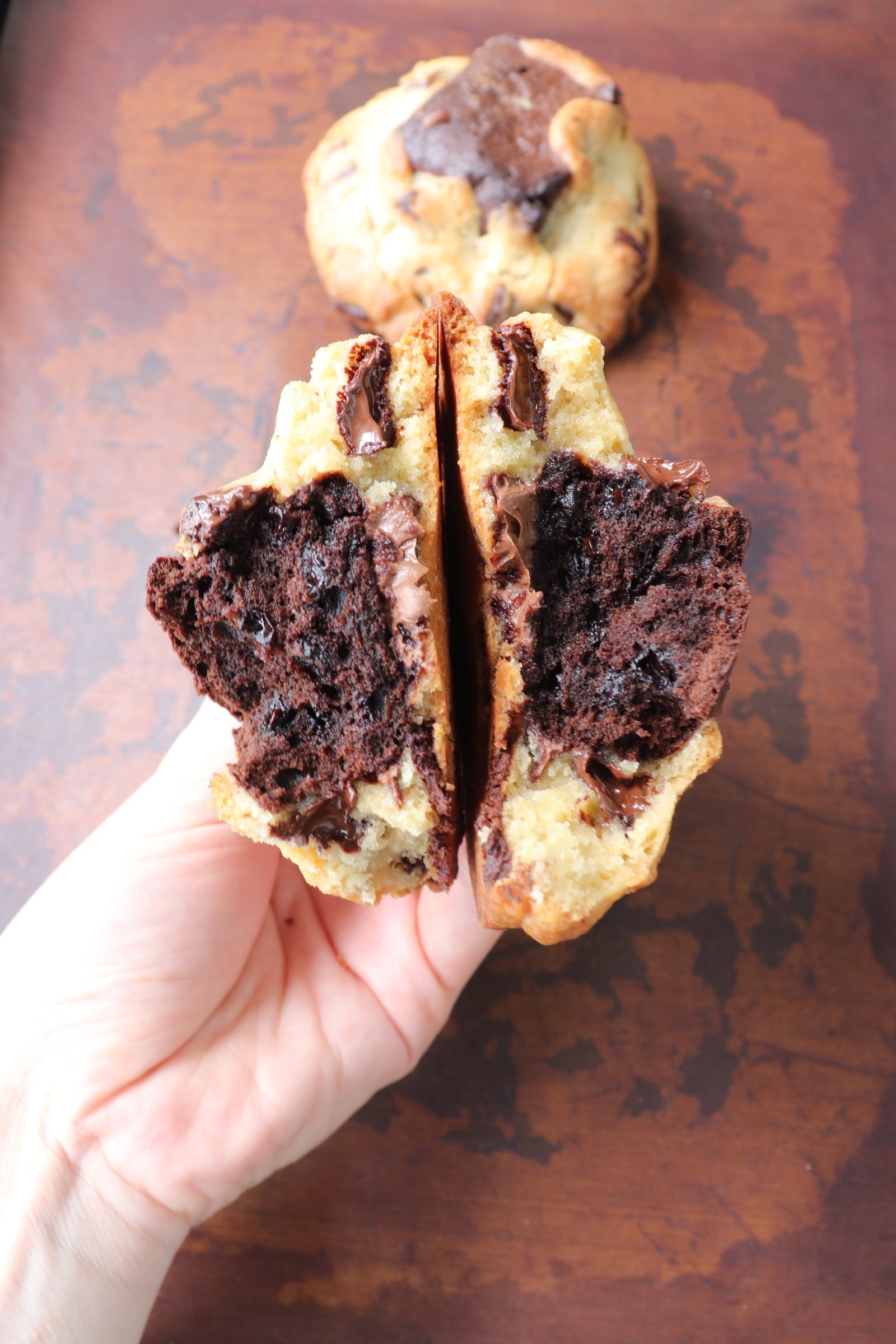 チョコ生地に自家製ブラウニーを包んで焼き上げたボリューム満点のアメリカンクッキー